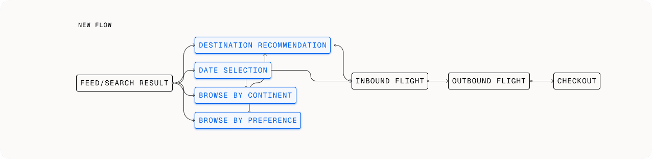 Whereas the original search experience consisted of a rigid structure going from destination to checkout, a more flexible experience accomodates for various intents by showing various kinds of results