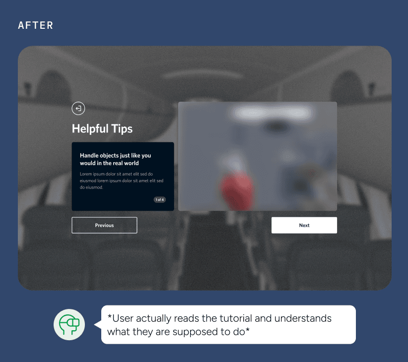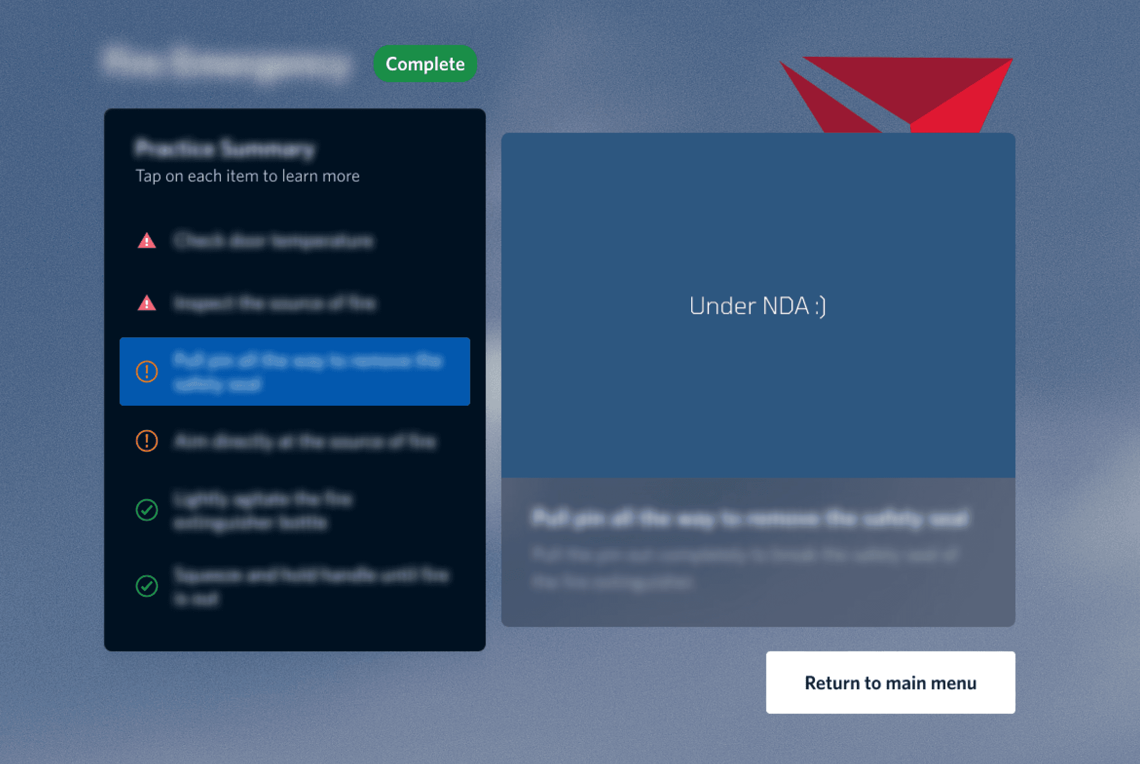 I worked closely with a team of strategists, researchers, and engineers to design and develop a VR experience slated to serve 3,6000+ flight attendants in training. The result was overwhelming satisfaction and future support from the training team.