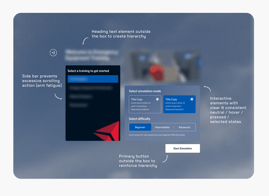 Training Selection Screen [After] – I redesigned components for VR, opting for simple and functional components to create an interface intuitive even for first-time VR users.
