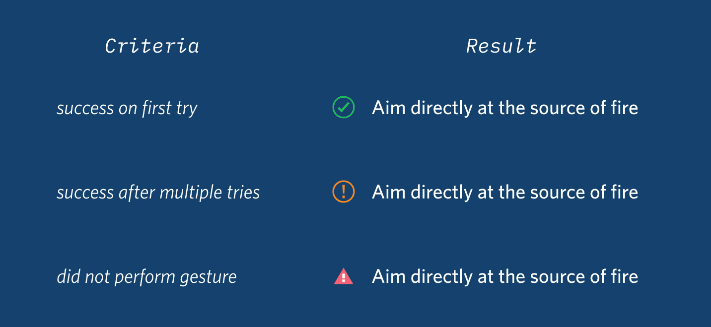 I first defined the criteria for success, failure, and caution with regard to each critical action performed by the user and gesture-tracked. The goal is to come up with a system that could track and give feedback on a range of user action.