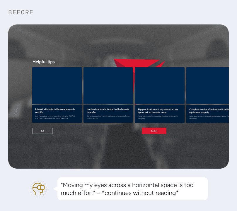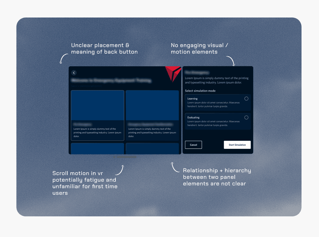 Training Selection Screen [Before] – Many of Delta's existing design system components were more suitable for smaller screen sizes like laptop and tablet, but combining them to fill the VR space felt overcrowding.